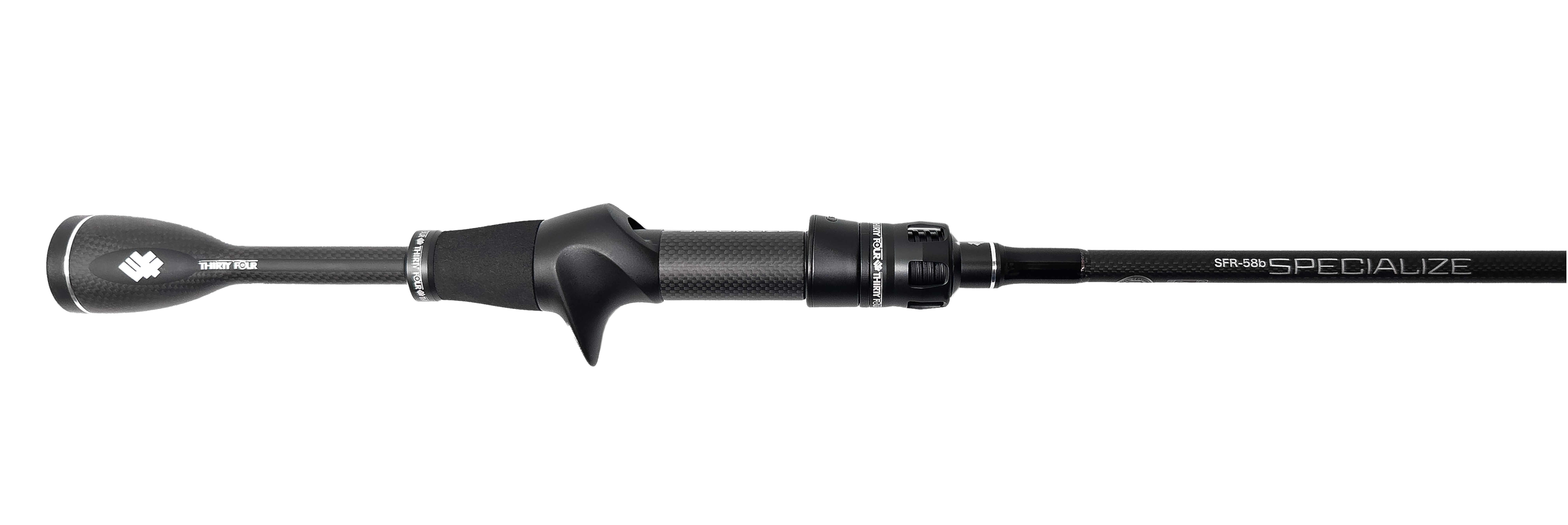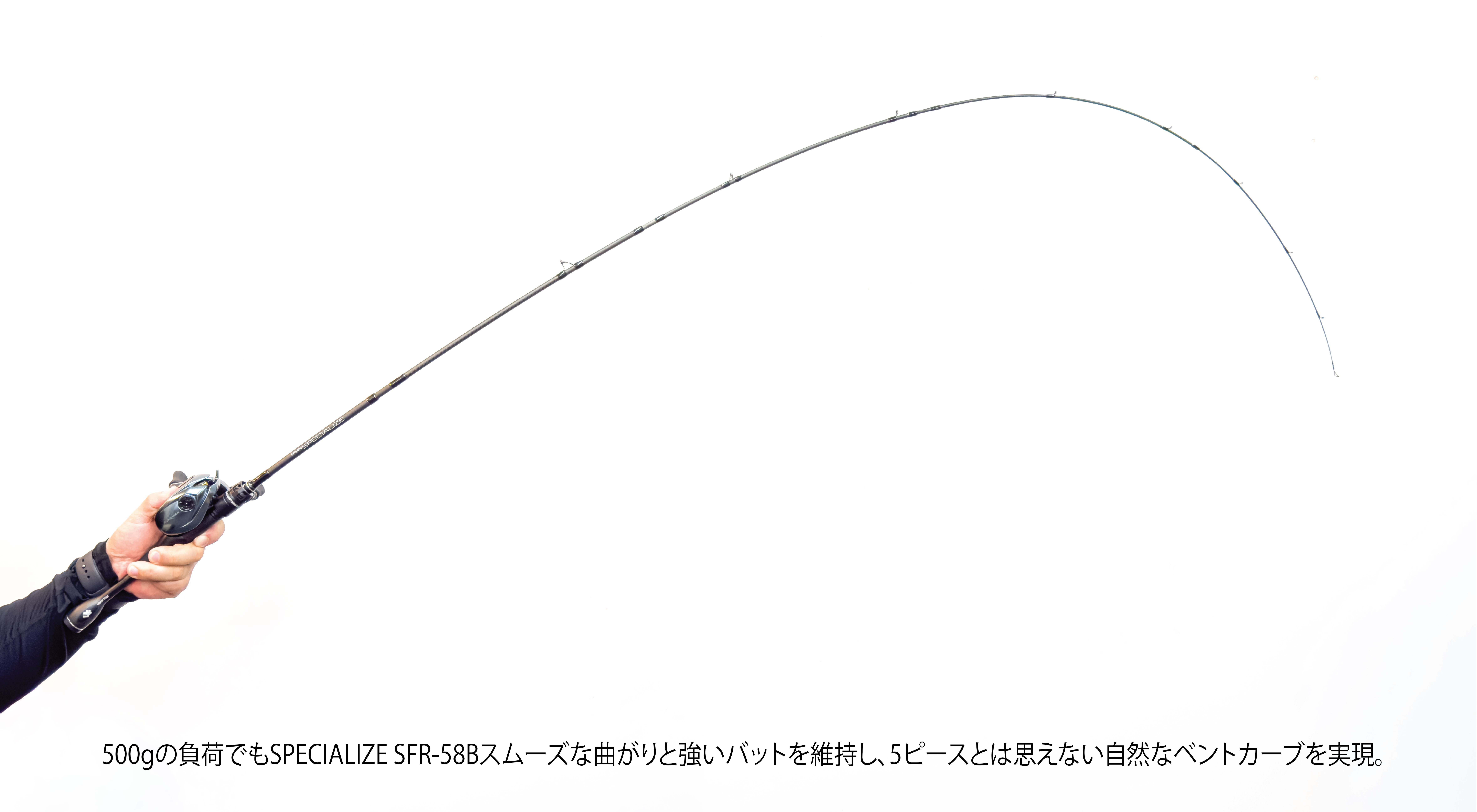 このロッドは私にとって一つの理想形となりましたが、「このブランクスなら、ベイトロッドとしても楽しめるのではないか?」という意見が開発チームから挙がったのです。確かにこのブランクスのベンディングであれば、無理なく幅広いリグをベイトリールでも投げることができるなと。また「ベイトリール」は「スピニングリール」に比べて扁平な形状をしており、省スペースかつトラベルギアとして優れている点が多い。そうした背景から、SFR58【B】の開発が動き出しました。